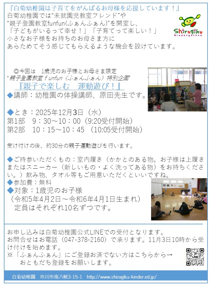 “親子登園教室funfun(ふぁんふぁん)特別企画「親子で楽しむ運動遊び」を行います。